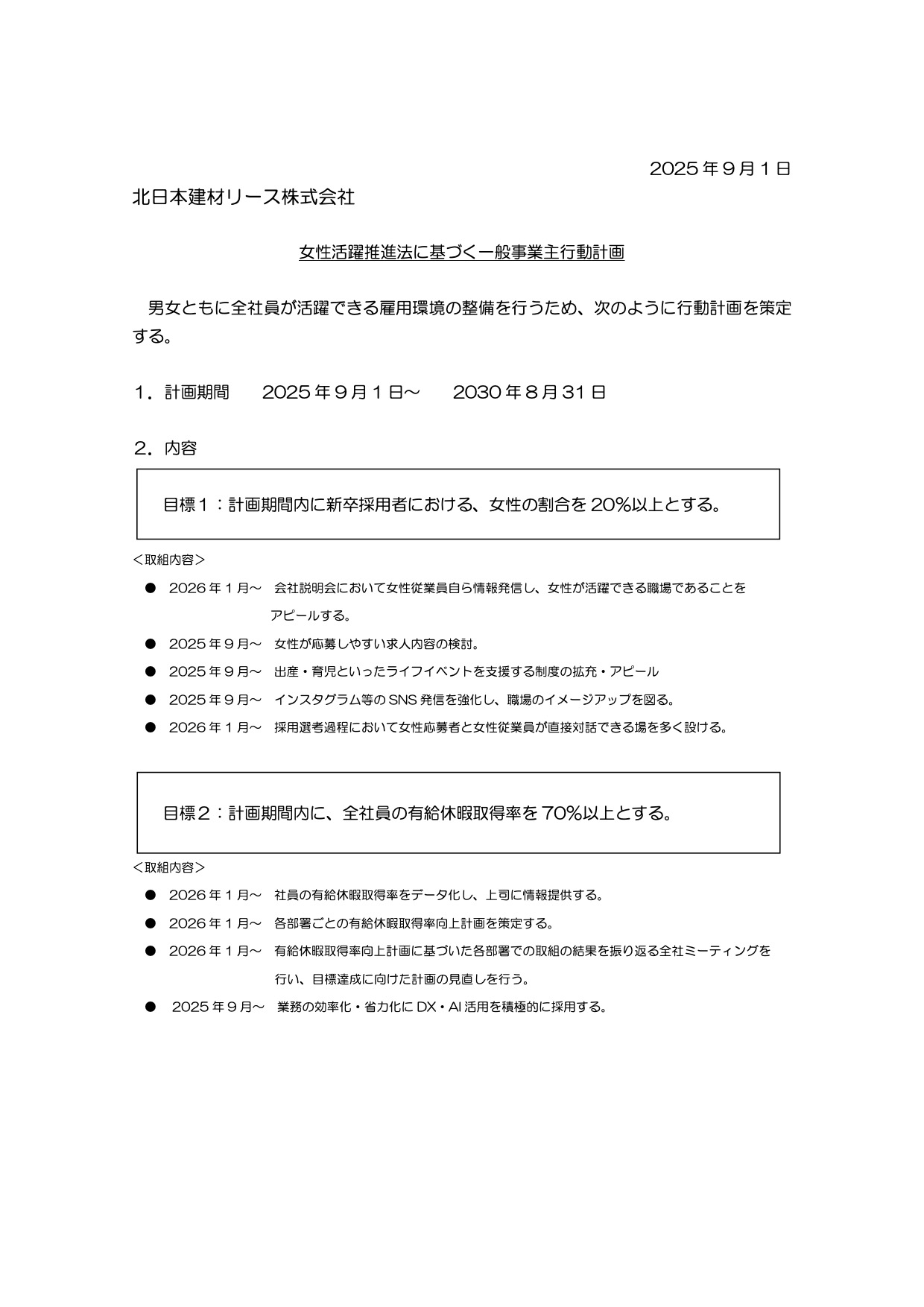 北日本建材リース株式会社 行動計画(女性活躍推進)